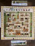 On a turn, you place one of your three dominoes on the game board, either on one of the four starting spaces or next to one or more dominoes already on the board so long as all the pieces match. (One critter at a time is a joker and can be placed next to whatever you want. The butterfly starts as the joker, and you can see multiple uses of butterflies this way in the image below.) The game includes ten types of critters, and each pairing of critters appears once on the 55 dominoes.