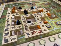 Kramer’s own games Wildlife Adventure and Expedition contain a similar piggybacking element as in those games players share three expeditions around the world, with each new segment of an expedition being placed after the most recent one. You want an expedition to reach secret locations in your hand so that you can score them, but ideally you can let someone else spend their turns getting an expedition close to such a location, then you can profit from it with little effort.